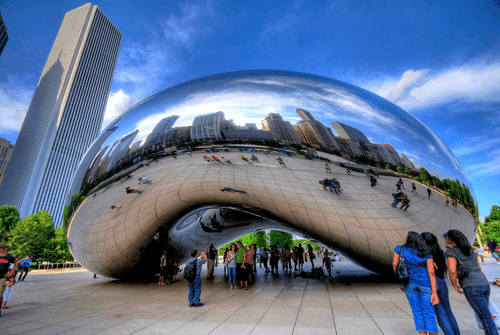 Another of Chicago's most famous attractions is Cloud Gate, a massive reflective sculpture by internationally recognized sculptor Anish Kapoor. Affectionately known throughout the world as the "Bean" because of its shape, Cloud Gate is best viewed on sunny days where the blue sky and skyscrapers are reflected and distorted in the sculpture's surface.