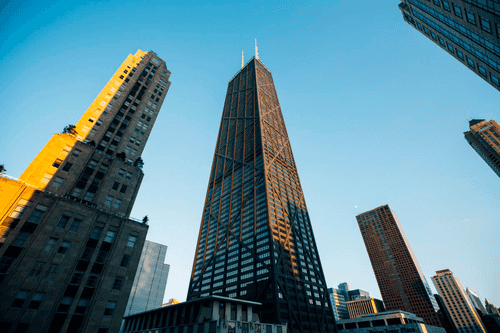 Also known by its address (875 N Michigan Avenue), the Hancock Tower is another of Chicago's famous skyscrapers. Although it does not have the same record-setting height as the nearby Willis Tower, it offers similar views of Chicago. In fact, the Observation Deck is almost 100 meters higher than the Willis Tower's SkyDeck. The Hancock tower is also home to TILT, a section of glass-plate windows that tilts 30 ̊ outward from the building, giving visitors the illusion of being suspended more than 1000 feet (310 meters) off the ground.